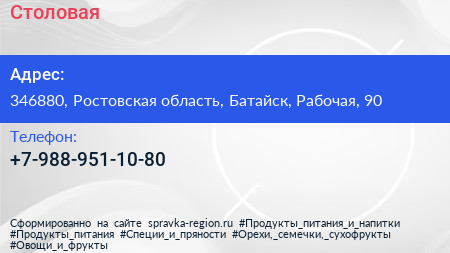 Столовая по адресу 346880, Ростовская область, Батайск, Рабочая, 90 в дальнейшем Организация, размещена в следующих категориях: