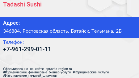 Tadashi Sushi по адресу 346884, Ростовская область, Батайск, Тельмана, 2Б в дальнейшем Организация, размещена в следующих категориях: