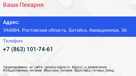 Ваша Пекарня по адресу 346884, Ростовская область, Батайск, Авиационная, 36 в дальнейшем Организация, размещена в следующих категориях: