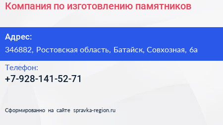 Компания по изготовлению памятников по адресу 346882, Ростовская область, Батайск, Совхозная, 6а в дальнейшем Организация, размещена в следующих категориях: