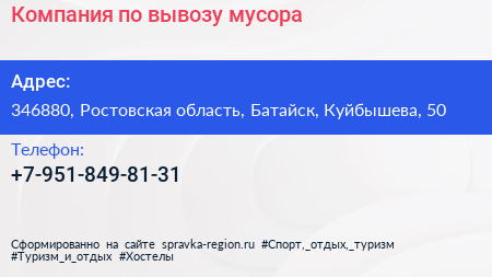 Компания по вывозу мусора по адресу 346880, Ростовская область, Батайск, Куйбышева, 50 в дальнейшем Организация, размещена в следующих категориях: