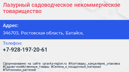 Лазурный, садоводческое некоммерческое товарищество по адресу 346703, Ростовская область, Батайск, в дальнейшем Организация, размещена в следующих категориях:
