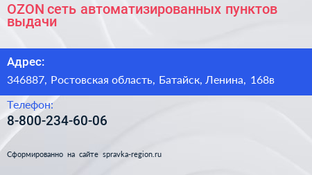 OZON, сеть автоматизированных пунктов выдачи по адресу 346887, Ростовская область, Батайск, Ленина, 168в в дальнейшем Организация, размещена в следующих категориях: