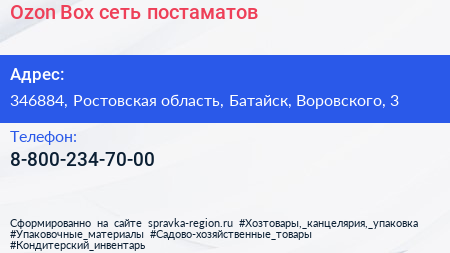 Ozon Box, сеть постаматов по адресу 346884, Ростовская область, Батайск, Воровского, 3 в дальнейшем Организация, размещена в следующих категориях: