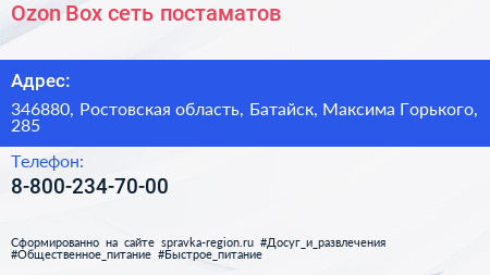 Ozon Box, сеть постаматов по адресу 346880, Ростовская область, Батайск, Максима Горького, 285 в дальнейшем Организация, размещена в следующих категориях: