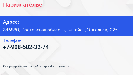 Париж, ателье по адресу 346880, Ростовская область, Батайск, Энгельса, 225 в дальнейшем Организация, размещена в следующих категориях: