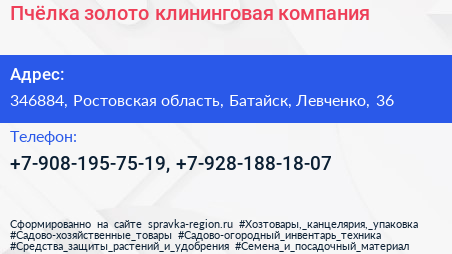Пчёлка-золото, клининговая компания по адресу 346884, Ростовская область, Батайск, Левченко, 36 в дальнейшем Организация, размещена в следующих категориях: