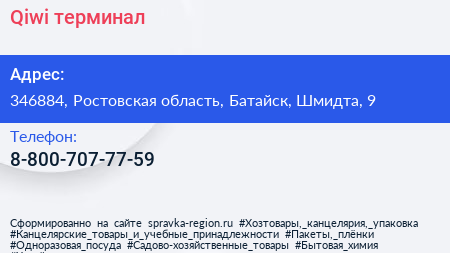 Qiwi, терминал по адресу 346884, Ростовская область, Батайск, Шмидта, 9 в дальнейшем Организация, размещена в следующих категориях: