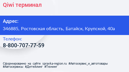 Qiwi, терминал по адресу 346885, Ростовская область, Батайск, Крупской, 40а в дальнейшем Организация, размещена в следующих категориях:
