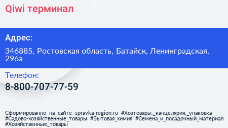 Qiwi, терминал по адресу 346885, Ростовская область, Батайск, Ленинградская, 296а в дальнейшем Организация, размещена в следующих категориях: