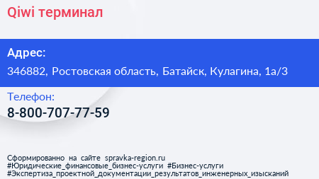Qiwi, терминал по адресу 346882, Ростовская область, Батайск, Кулагина, 1а/3 в дальнейшем Организация, размещена в следующих категориях: