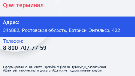 Qiwi, терминал по адресу 346882, Ростовская область, Батайск, Энгельса, 422 в дальнейшем Организация, размещена в следующих категориях: