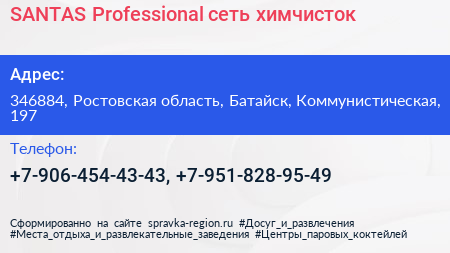SANTAS Professional, сеть химчисток по адресу 346884, Ростовская область, Батайск, Коммунистическая, 197 в дальнейшем Организация, размещена в следующих категориях: