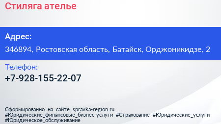 Стиляга, ателье по адресу 346894, Ростовская область, Батайск, Орджоникидзе, 2 в дальнейшем Организация, размещена в следующих категориях: