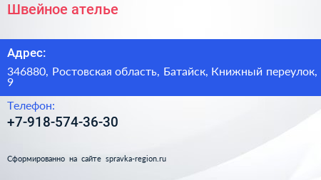 Швейное ателье по адресу 346880, Ростовская область, Батайск, Книжный переулок, 9 в дальнейшем Организация, размещена в следующих категориях: