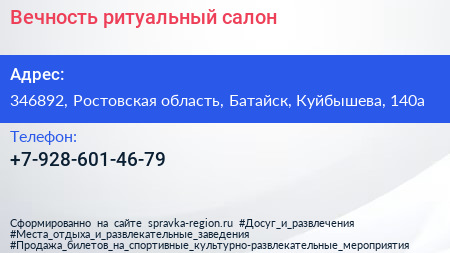 Вечность, ритуальный салон по адресу 346892, Ростовская область, Батайск, Куйбышева, 140а в дальнейшем Организация, размещена в следующих категориях:
