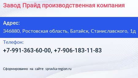 Завод Прайд, производственная компания по адресу 346880, Ростовская область, Батайск, Станиславского, 1д в дальнейшем Организация, размещена в следующих категориях: