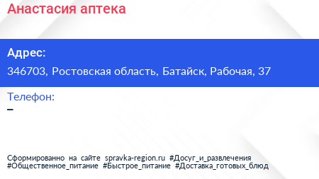 Анастасия, аптека по адресу 346703, Ростовская область, Батайск, Рабочая, 37 в дальнейшем Организация, размещена в следующих категориях: