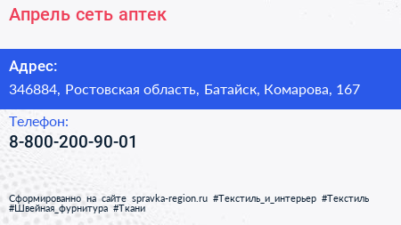 Апрель, сеть аптек по адресу 346884, Ростовская область, Батайск, Комарова, 167 в дальнейшем Организация, размещена в следующих категориях: