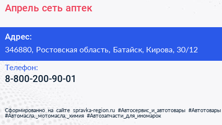 Апрель, сеть аптек по адресу 346880, Ростовская область, Батайск, Кирова, 30/12 в дальнейшем Организация, размещена в следующих категориях: