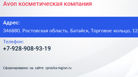 Avon, косметическая компания по адресу 346880, Ростовская область, Батайск, Торговое кольцо, 12 в дальнейшем Организация, размещена в следующих категориях: