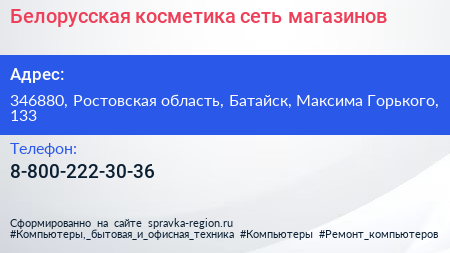 Белорусская косметика, сеть магазинов по адресу 346880, Ростовская область, Батайск, Максима Горького, 133 в дальнейшем Организация, размещена в следующих категориях: