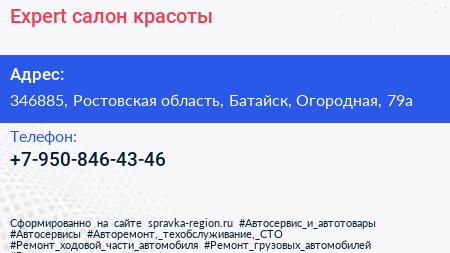 Expert, салон красоты по адресу 346885, Ростовская область, Батайск, Огородная, 79а в дальнейшем Организация, размещена в следующих категориях: