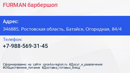 FURMAN, барбершоп по адресу 346885, Ростовская область, Батайск, Огородная, 84/4 в дальнейшем Организация, размещена в следующих категориях: