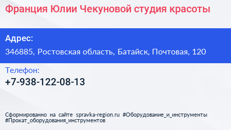 Франция Юлии Чекуновой, студия красоты по адресу 346885, Ростовская область, Батайск, Почтовая, 120 в дальнейшем Организация, размещена в следующих категориях: