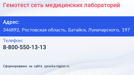 Гемотест, сеть медицинских лабораторий по адресу 346892, Ростовская область, Батайск, Луначарского, 197 в дальнейшем Организация, размещена в следующих категориях: