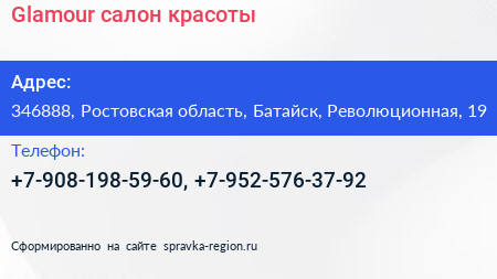 Glamour, салон красоты по адресу 346888, Ростовская область, Батайск, Революционная, 19 в дальнейшем Организация, размещена в следующих категориях: