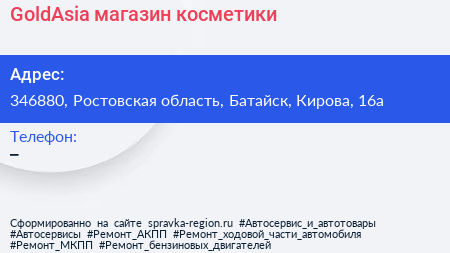GoldAsia, магазин косметики по адресу 346880, Ростовская область, Батайск, Кирова, 16а в дальнейшем Организация, размещена в следующих категориях: