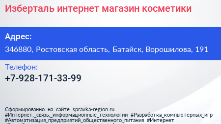 Изберталь, интернет-магазин косметики по адресу 346880, Ростовская область, Батайск, Ворошилова, 191 в дальнейшем Организация, размещена в следующих категориях: