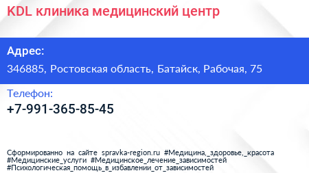 KDL клиника, медицинский центр по адресу 346885, Ростовская область, Батайск, Рабочая, 75 в дальнейшем Организация, размещена в следующих категориях: