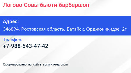 Логово Совы, бьюти-барбершоп по адресу 346894, Ростовская область, Батайск, Орджоникидзе, 2г в дальнейшем Организация, размещена в следующих категориях: