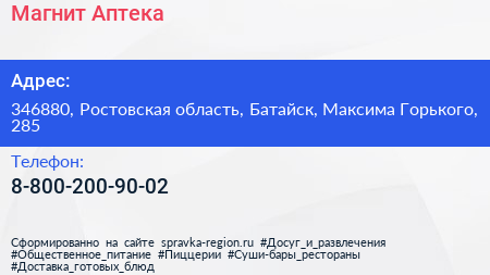 Магнит-Аптека по адресу 346880, Ростовская область, Батайск, Максима Горького, 285 в дальнейшем Организация, размещена в следующих категориях: