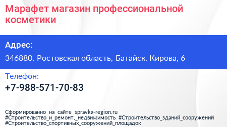 Марафет, магазин профессиональной косметики по адресу 346880, Ростовская область, Батайск, Кирова, 6 в дальнейшем Организация, размещена в следующих категориях:
