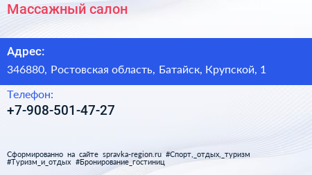 Массажный салон по адресу 346880, Ростовская область, Батайск, Крупской, 1 в дальнейшем Организация, размещена в следующих категориях: