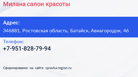 Милана, салон красоты по адресу 346881, Ростовская область, Батайск, Авиагородок, 46 в дальнейшем Организация, размещена в следующих категориях: