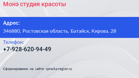 Монэ, студия красоты по адресу 346880, Ростовская область, Батайск, Кирова, 28 в дальнейшем Организация, размещена в следующих категориях: