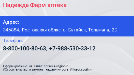 Надежда-Фарм, аптека по адресу 346884, Ростовская область, Батайск, Тельмана, 2Б в дальнейшем Организация, размещена в следующих категориях:
