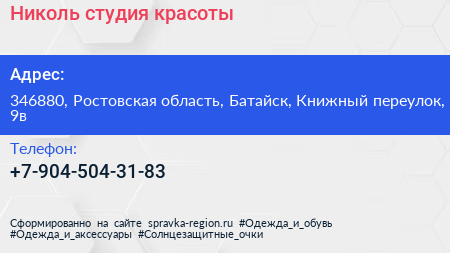 Николь, студия красоты по адресу 346880, Ростовская область, Батайск, Книжный переулок, 9в в дальнейшем Организация, размещена в следующих категориях: