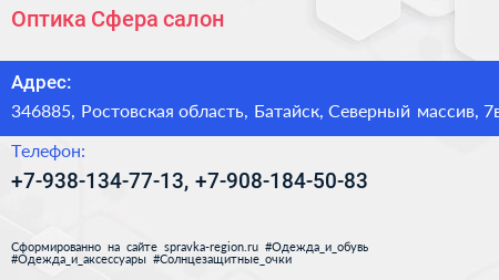 Оптика Сфера, салон по адресу 346885, Ростовская область, Батайск, Северный массив, 7в в дальнейшем Организация, размещена в следующих категориях: