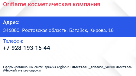 Oriflame, косметическая компания по адресу 346880, Ростовская область, Батайск, Кирова, 18 в дальнейшем Организация, размещена в следующих категориях: