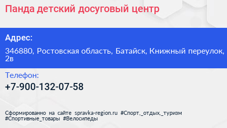 Панда, детский досуговый центр по адресу 346880, Ростовская область, Батайск, Книжный переулок, 2в в дальнейшем Организация, размещена в следующих категориях:
