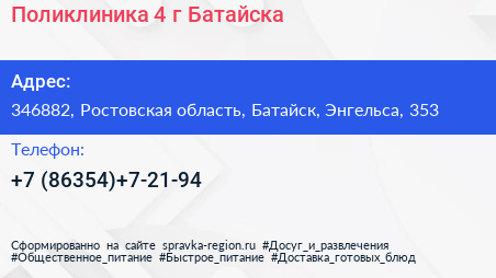 Поликлиника №4 г. Батайска по адресу 346882, Ростовская область, Батайск, Энгельса, 353 в дальнейшем Организация, размещена в следующих категориях: