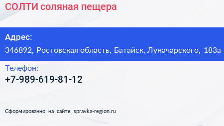 СОЛТИ, соляная пещера по адресу 346892, Ростовская область, Батайск, Луначарского, 183а в дальнейшем Организация, размещена в следующих категориях: