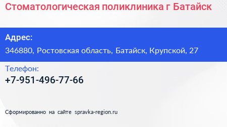 Стоматологическая поликлиника, г. Батайск по адресу 346880, Ростовская область, Батайск, Крупской, 27 в дальнейшем Организация, размещена в следующих категориях: