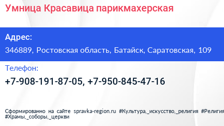 Умница & Красавица, парикмахерская по адресу 346889, Ростовская область, Батайск, Саратовская, 109 в дальнейшем Организация, размещена в следующих категориях: