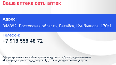 Ваша аптека, сеть аптек по адресу 346892, Ростовская область, Батайск, Куйбышева, 170/1 в дальнейшем Организация, размещена в следующих категориях: